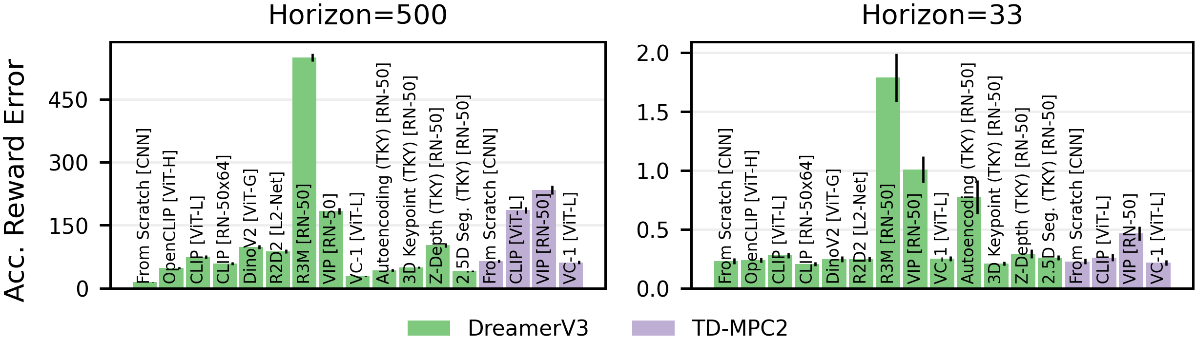 Based on our results so far, we finally investigate how different visual representations affect the quality of the world model in MBRL. We analyze dynamics prediction error and reward prediction error, finding that reward prediction accuracy is more important for performance. PVRs may not provide enough information to predict rewards as accurately as representations learned from scratch.