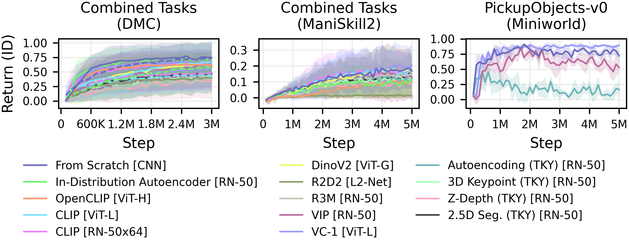 Average performance on DMC, ManiSkill2 and Miniworld tasks in the OOD setting.