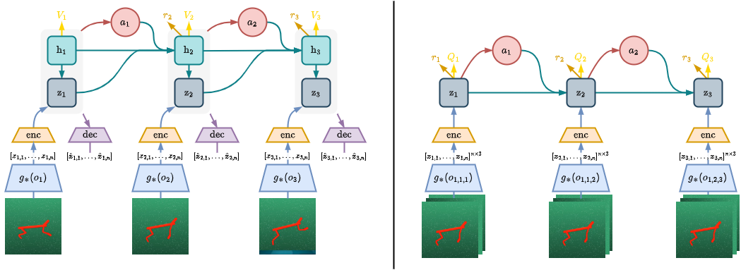 Components of our PVR-based DreamerV3 (left) and TD-MPC2 (right) architectures.