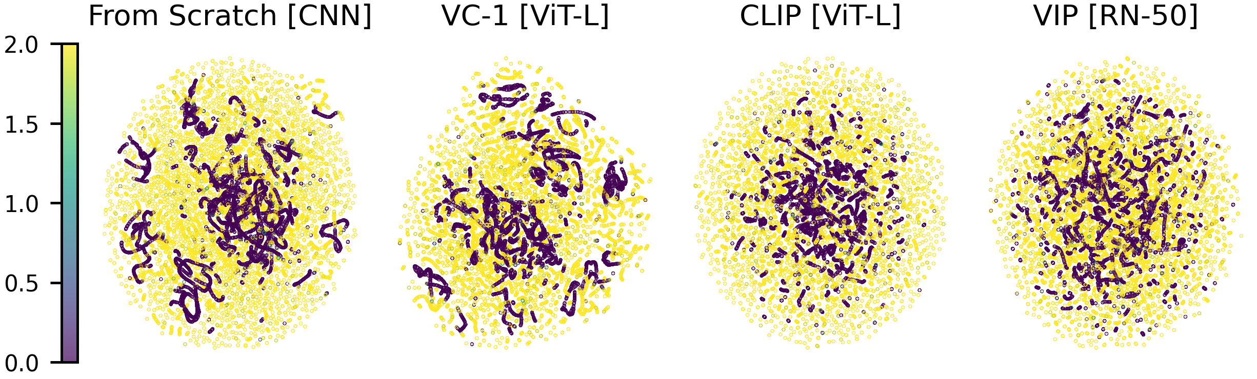 To investigate reward-related data in representations, we analyze UMAP projections of the latent state space in the Pendulum Swingup task. Representations learned from scratch and similar performing methods like VC-1 clearly encode reward information, with states of similar rewards clustered together. This lack of reward embedding in many PVRs may explain their underperformance compared to learned-from-scratch representations. Accurate reward extraction is essential for learning effective policies, which is hindered if reward information is not consistently embedded.