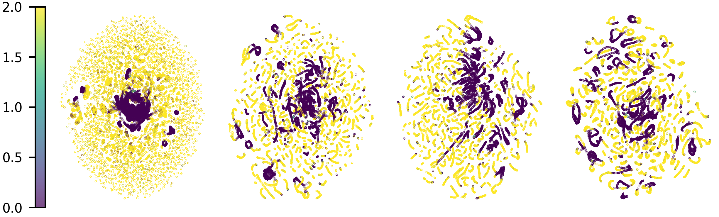 UMAP projections of DreamerV3 (top row) and TD-MPC2 (bottom row)